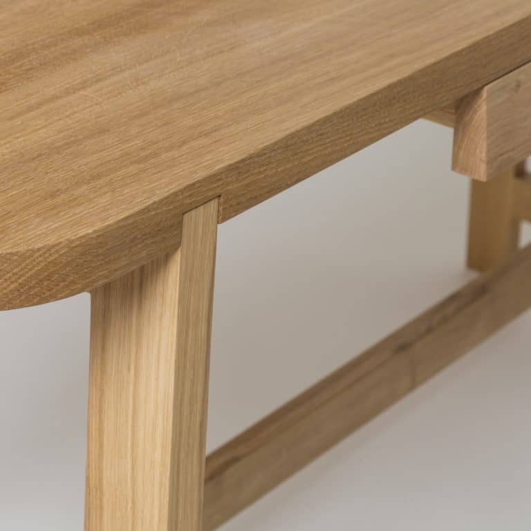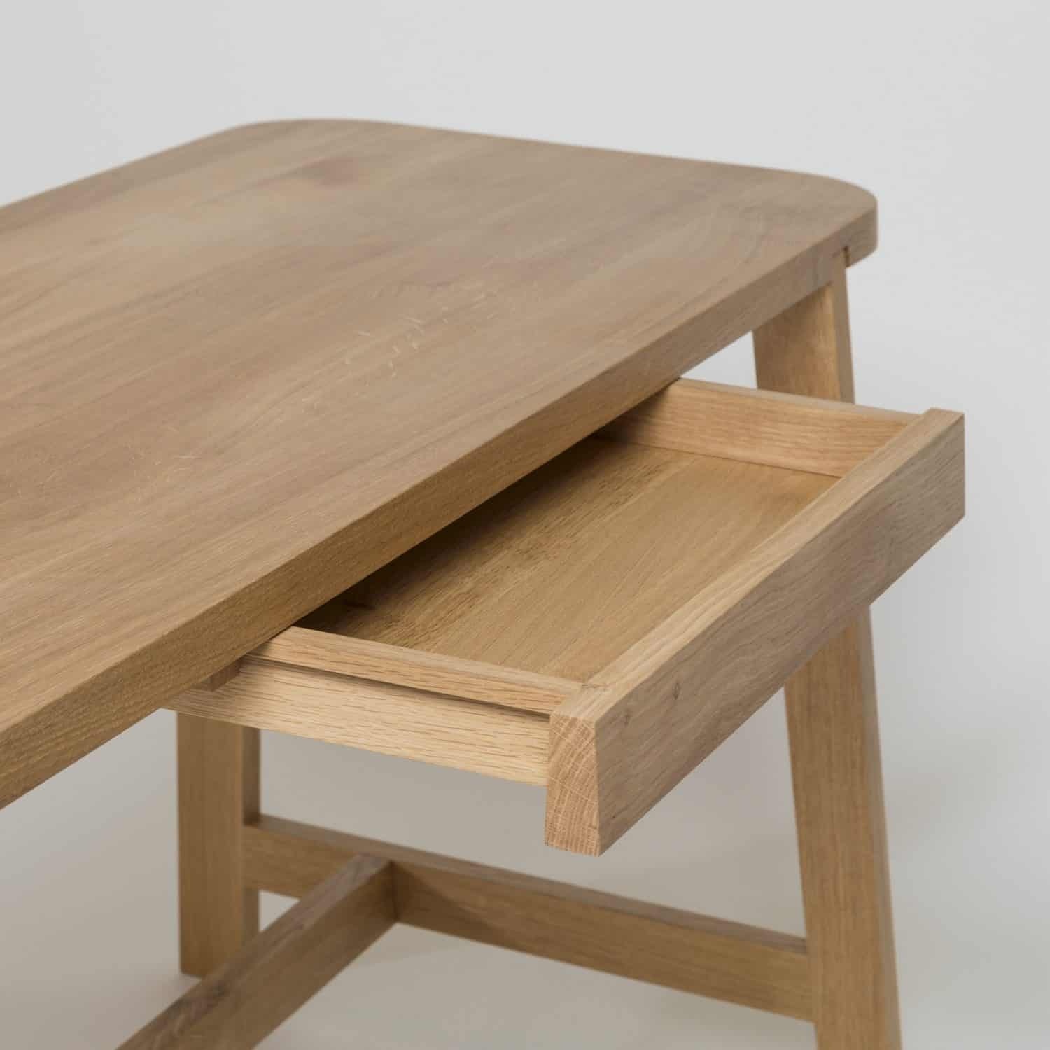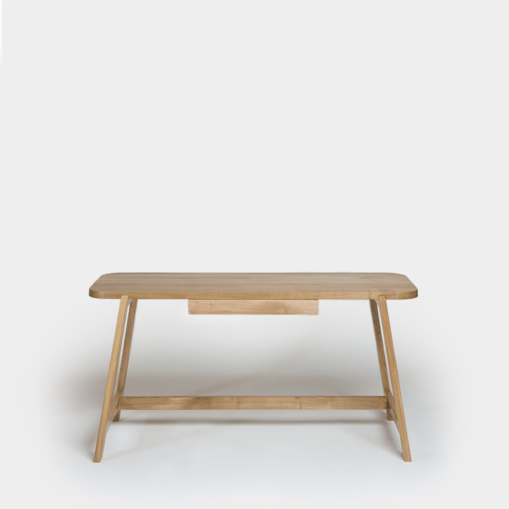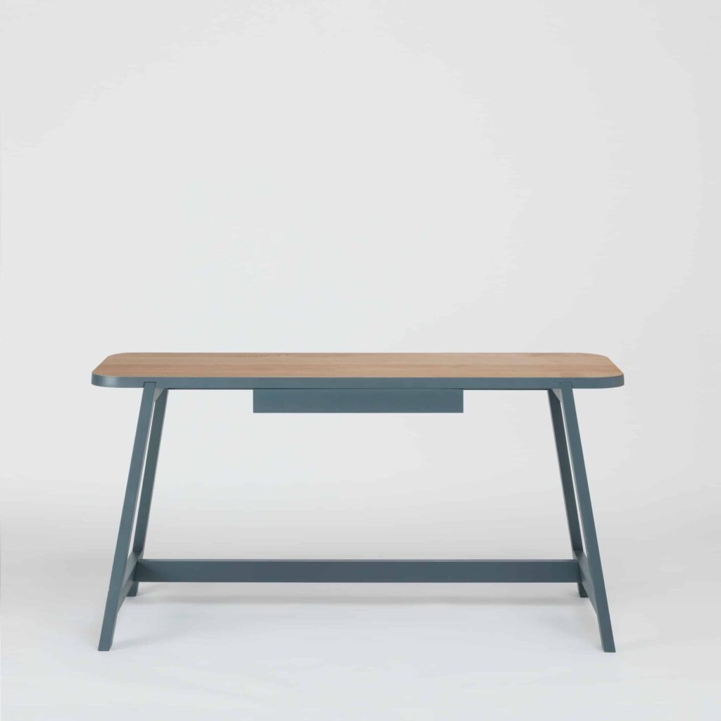 Desk Three heeft een blad met licht afgeronde hoeken, een centraal geplaatste lade en het kenmerkende onderstel in trestle-stijl van deze meubelcollectie. Ook verkrijgbaar met een grijs gelakte rand en onderstel.
