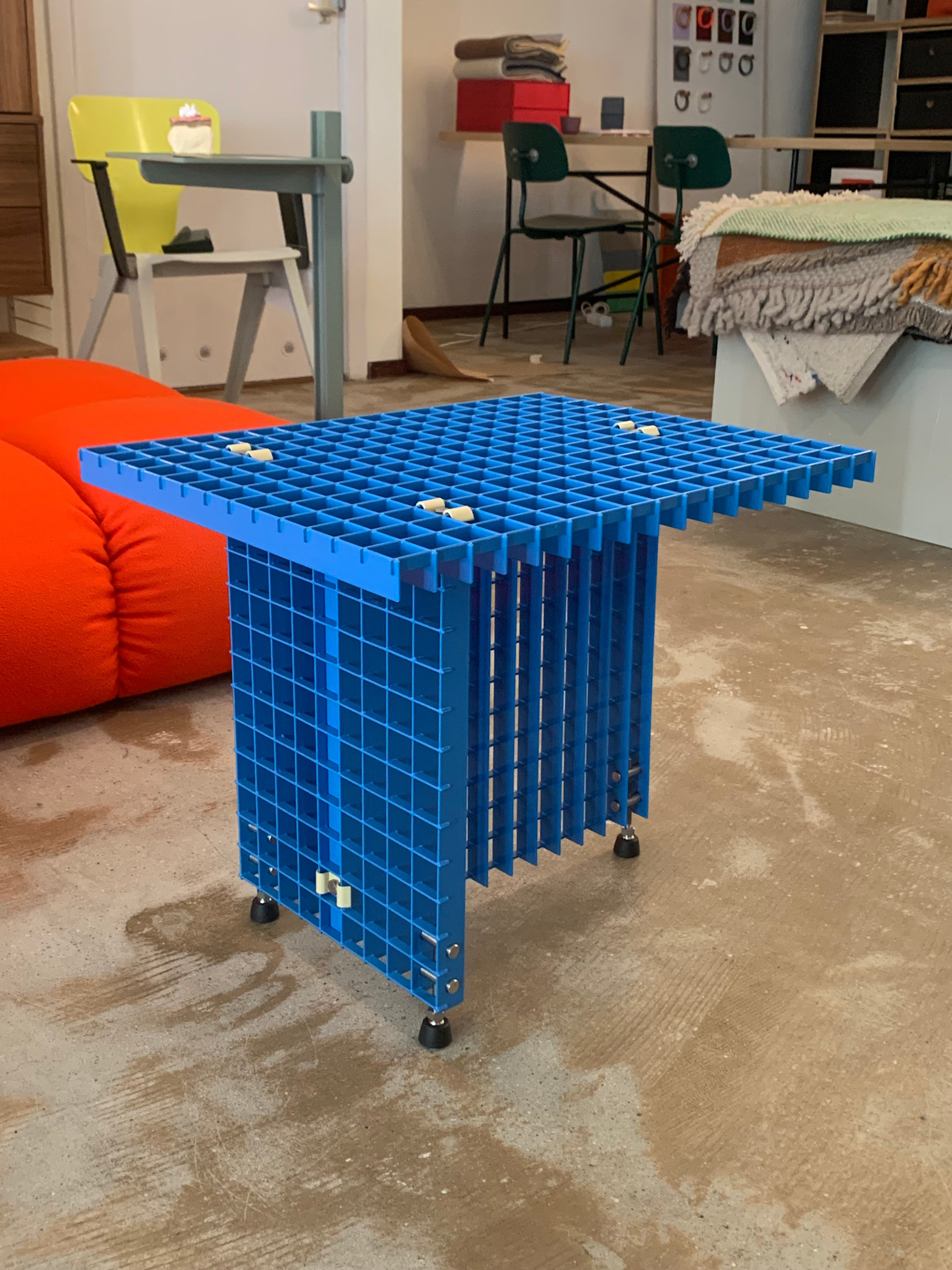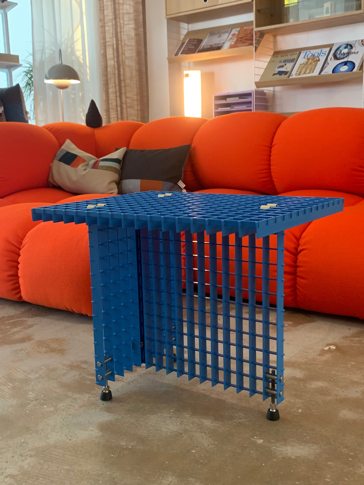 De GRID-collectie is vervaardigd uit restanten van gegalvaniseerde roosters die oorspronkelijk dienden als vloeren en veiligheidsbarrières in industriële gebouwen. Deze afgedankte elementen worden herbouwd tot meubelstukken, waarbij vorm en kleur zorgvuldig worden ingezet om nieuwe betekenis te geven. De objecten zijn gepoedercoat voor duurzaamheid en een zachtere uitstraling. De stukken zijn geschikt voor binnen- én buitengebruik.