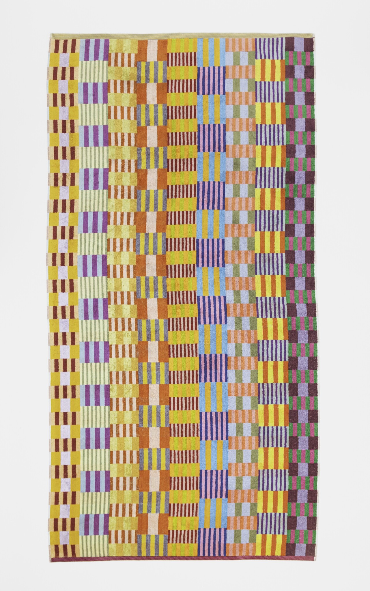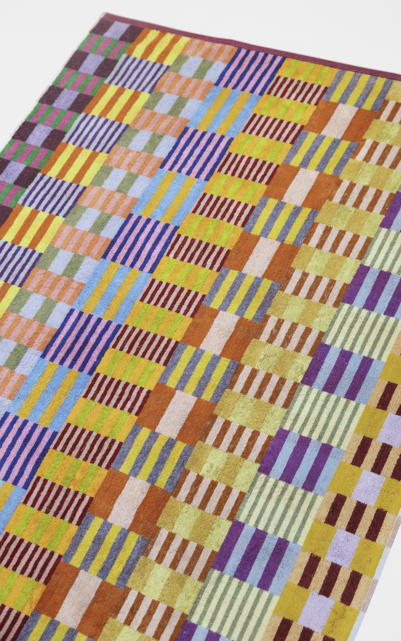 Deze strand handdoeken is gemaakt van restjes uit de industrie. Wanneer fabrieken garens verven om textiel te weven, maken ze wat extra - voor het geval dat - maar die blijven vaak ongebruikt. Foekje Fleur gebruikte deze restanten voor haar Odds & Ends textiel waardoor onverwachte kleurencombinaties ontstaan.