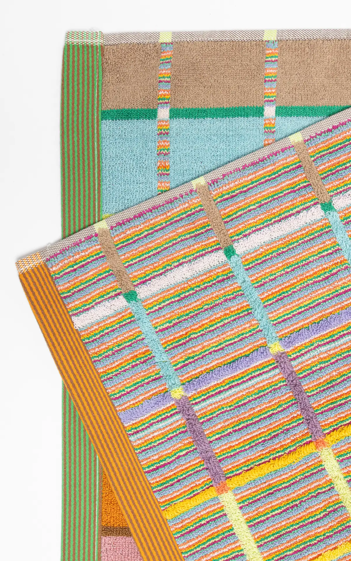 Deze badmat is gemaakt van restjes uit de industrie. Wanneer fabrieken garens verven om textiel te weven, maken ze wat extra - voor het geval dat - maar die blijven vaak ongebruikt. Foekje Fleur gebruikte deze restanten voor haar Odds & Ends textiel waardoor onverwachte kleurencombinaties ontstaan.
